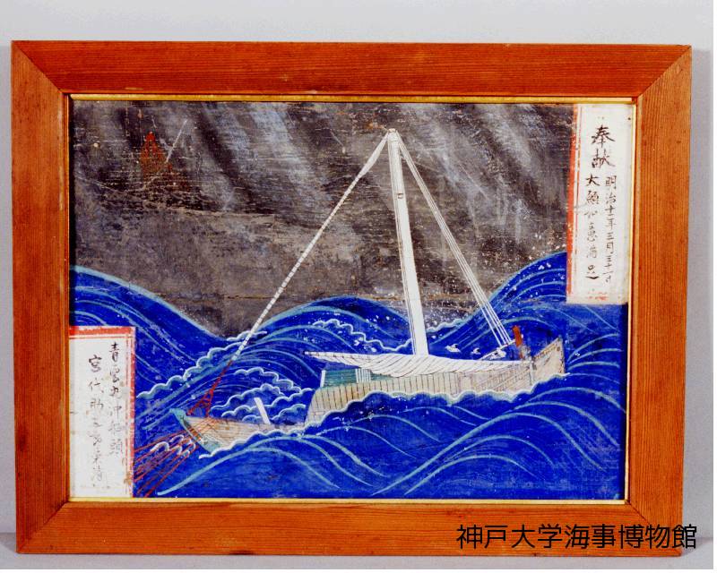 | 「絵馬:青雲丸」 明治12年3月、沖船頭宮代助五郎栄清奉納。絵馬藤系統の遭難絵馬。入手した時は損傷がひどく、表具師の手による補修がはなはだしい。人物が波間に浮かぶようになり、左上の御幣が本来金色のものが赤で描かれている。 (研究年報:平成4年№20 樋口元巳専門員) |